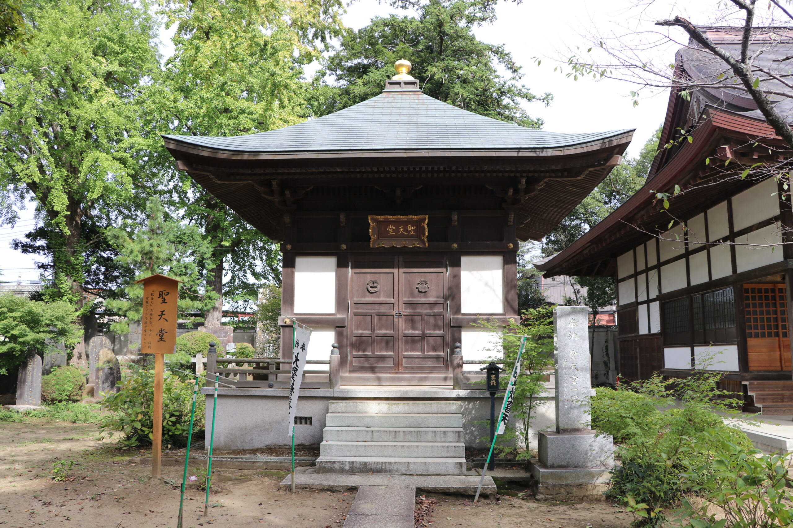 昭和62年11月に建立された聖天堂には東勝寺を創建した征夷大将軍 坂上田村麻呂(さかのうえたむらまろ)の持仏と伝えられる大聖 歓喜天尊像をお祀りしています。